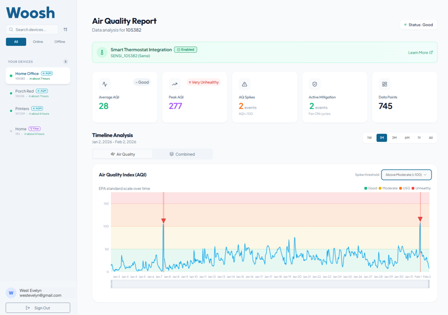 The Woosh Dashboard brings your home’s air system into focus, showing you filter health, HVAC system performance, air quality trends, alerts and mitigations.